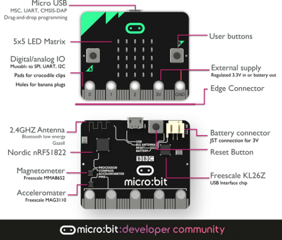 The board is 4 cm × 5 cm and has an ARM Cortex-M0 processor, accelerometer and magnetometer sensors, Bluetooth and USB connectivity, a display consisting of 25 LEDs, two programmable buttons, and can be powered by either USB or an external battery pack. The device inputs and outputs are through five ring connectors that are part of the 23-pin edge connector. We can do pretty cool stuff with this micro bit and I am going to show you one.