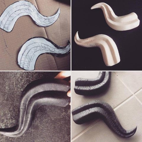 Making horns for any costume is a process. They have to hold the proper shape, be designed so that they can be attached to the head, and be lightweight enough that they don’t fall off or cause a headache. The cosplayer Lady Sundae had to keep that in mind when designing the horns that were part of her World of Warcraft Draenei Warrior costume. She shared process images showing off the stages of the horns. She began with paper templates and used a material called “polyextru” to build the layers and to shape them before covering them with black Worbla. She used carving tools to add the texture and details.